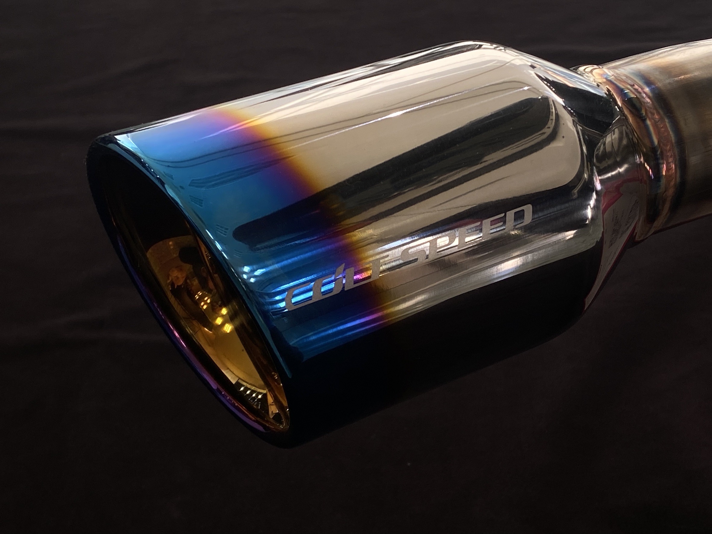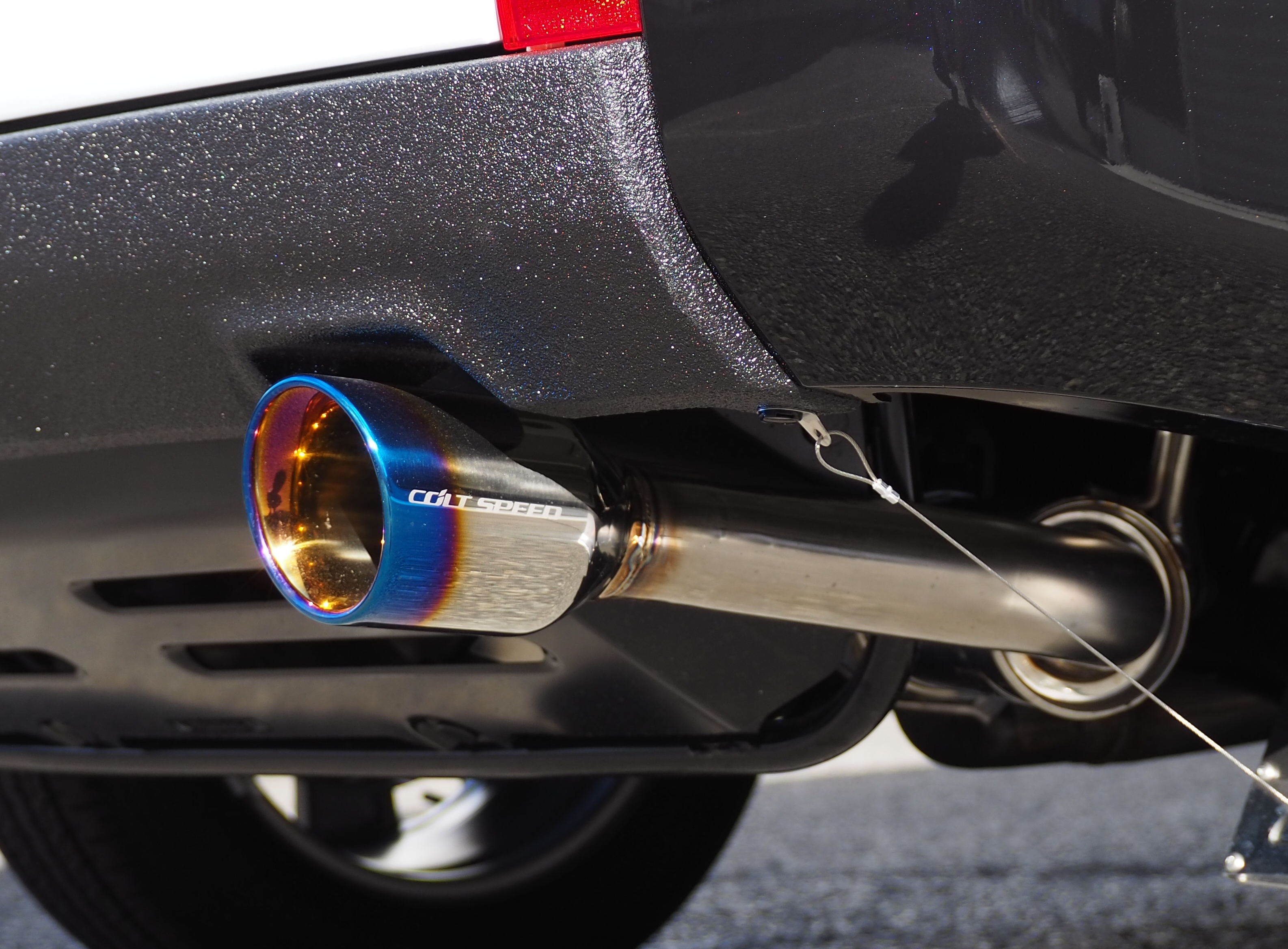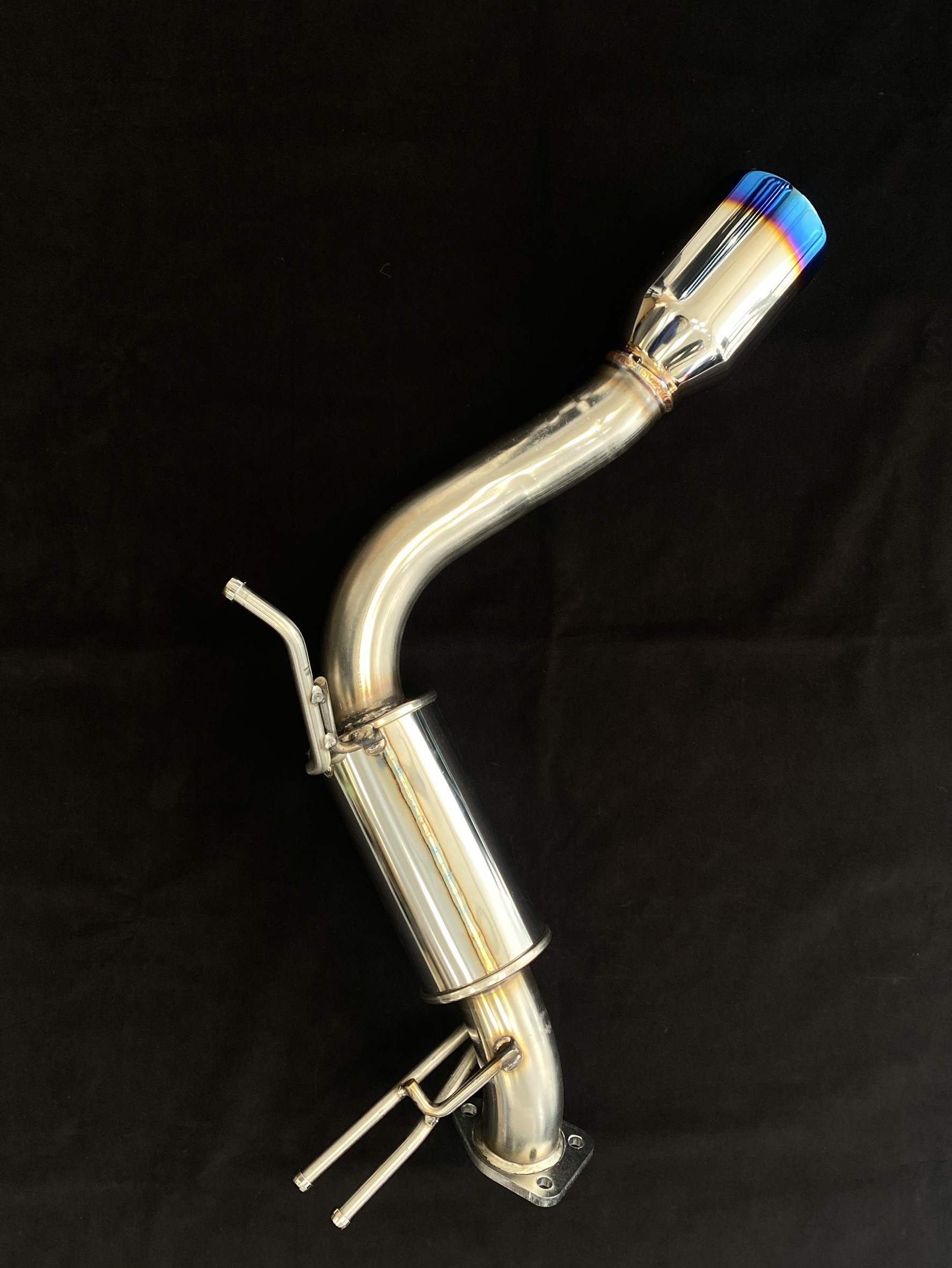 ストレート構造のサイレンサーを縦置きで配置し60.5φのパイプと100φのテールエンドと組み合わせました。ラウンド形状のテールの処理はチタンカラーで更に高級感を高めています。